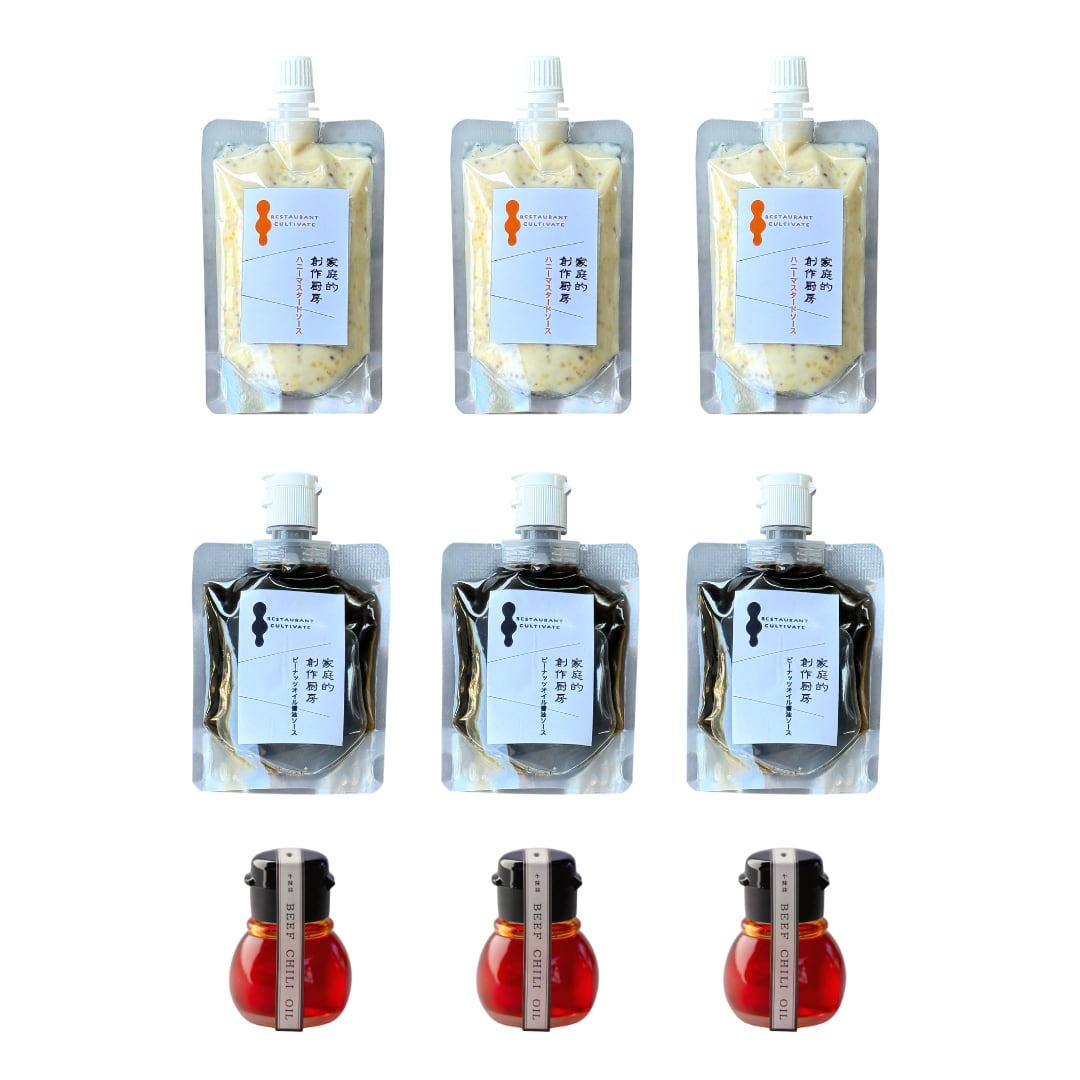 SALE【家庭的創作厨房】ピーナッツオイル醤油ソース(3個) & ハニーマスタードソース(3個) & 松阪牛辣油(小 / 3個) セット