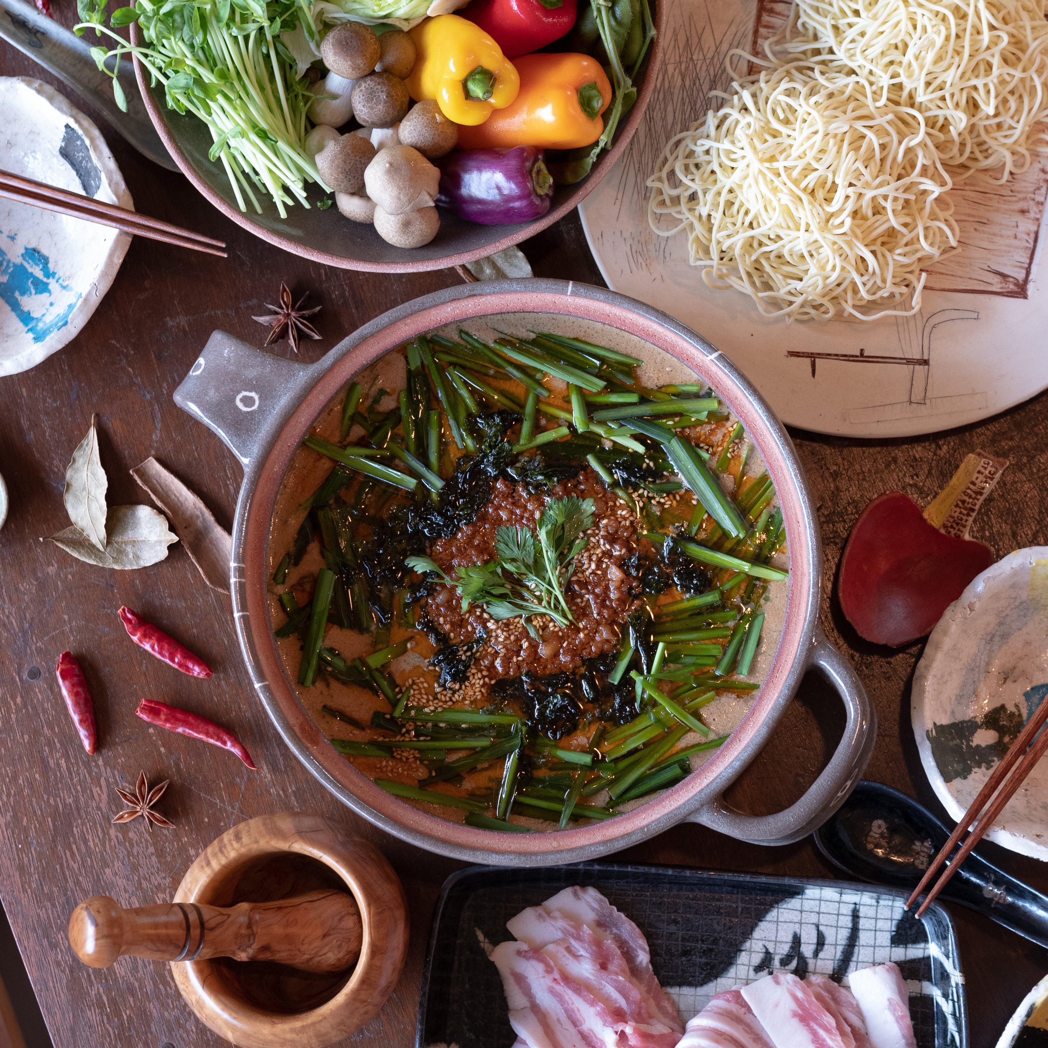 鶏ガラスープをベースにおから入り豆乳と美容や健康に欠かせない栄養たっぷりの胡麻ペーストを贅沢に使った、濃厚な豆乳スープに花椒、八角、陳皮など約十種類のスパイスをブレンドして作ったオリジナルのラー油を加えることによって豊かな味わいになります。そして、そのスープに合わせる生麺は、余分な塩分、卵を使用せず製麺して頂きました。芳醇な胡麻の風味と薫るラー油との相性もお楽しみください。身体と心が幸せになりますように。
